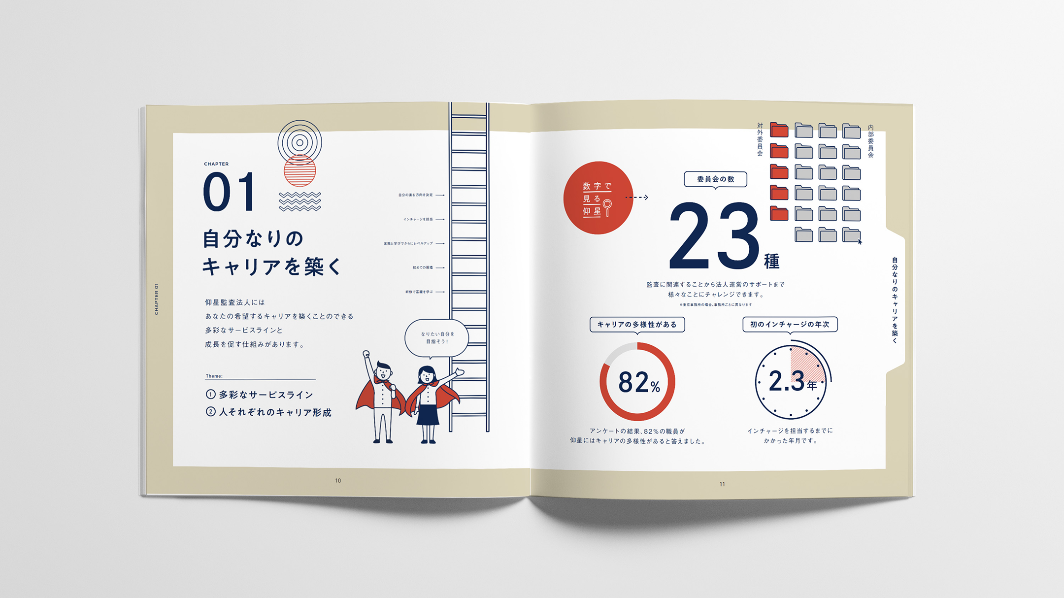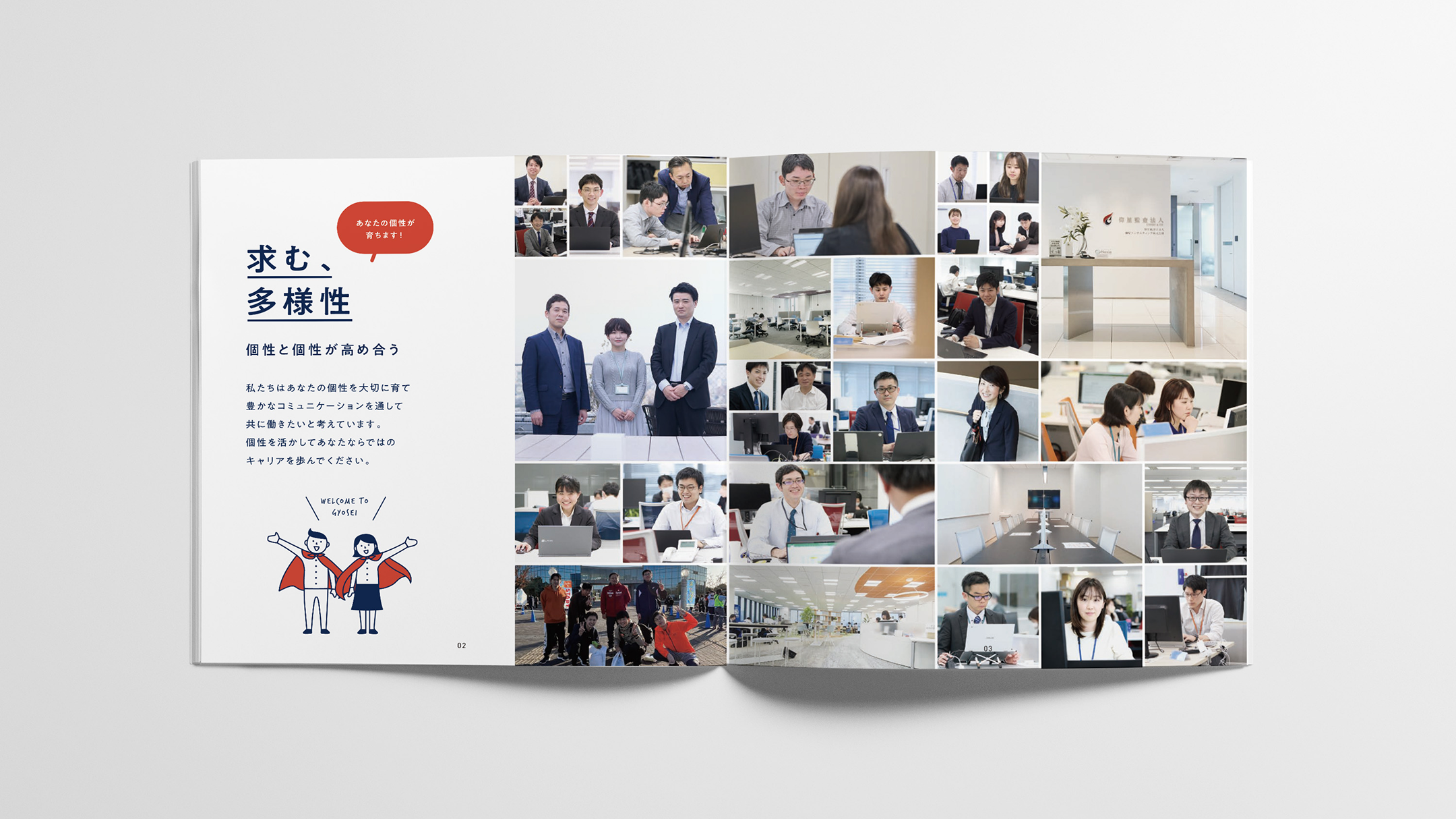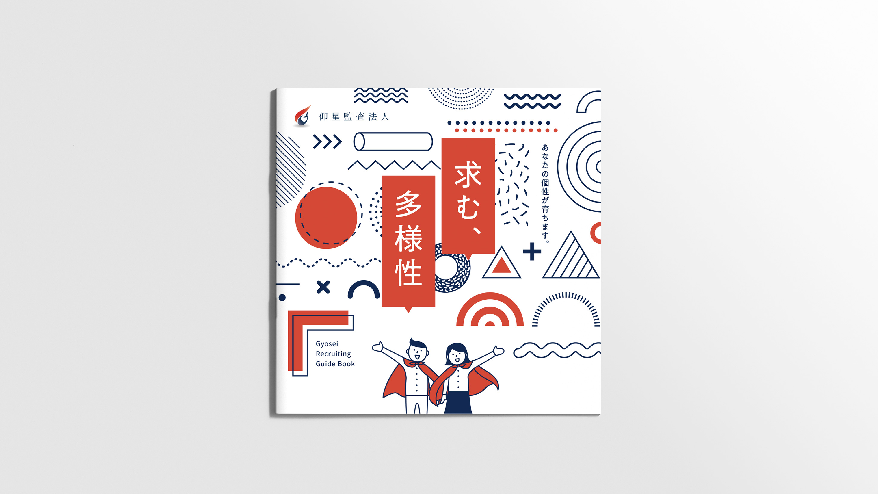 全国主要都市に拠点を持ち、準大手に位置づけられる仰星監査法人。固い印象になりがちな業界イメージを和らげるため、オリジナルキャラクターを開発。キャラクターが案内役として登場し、業務の内容や社内の雰囲気を、親近感のある語り口で紹介しています。専門性と誠実さをベースとした、親しみやすいパンフレットとなりました。