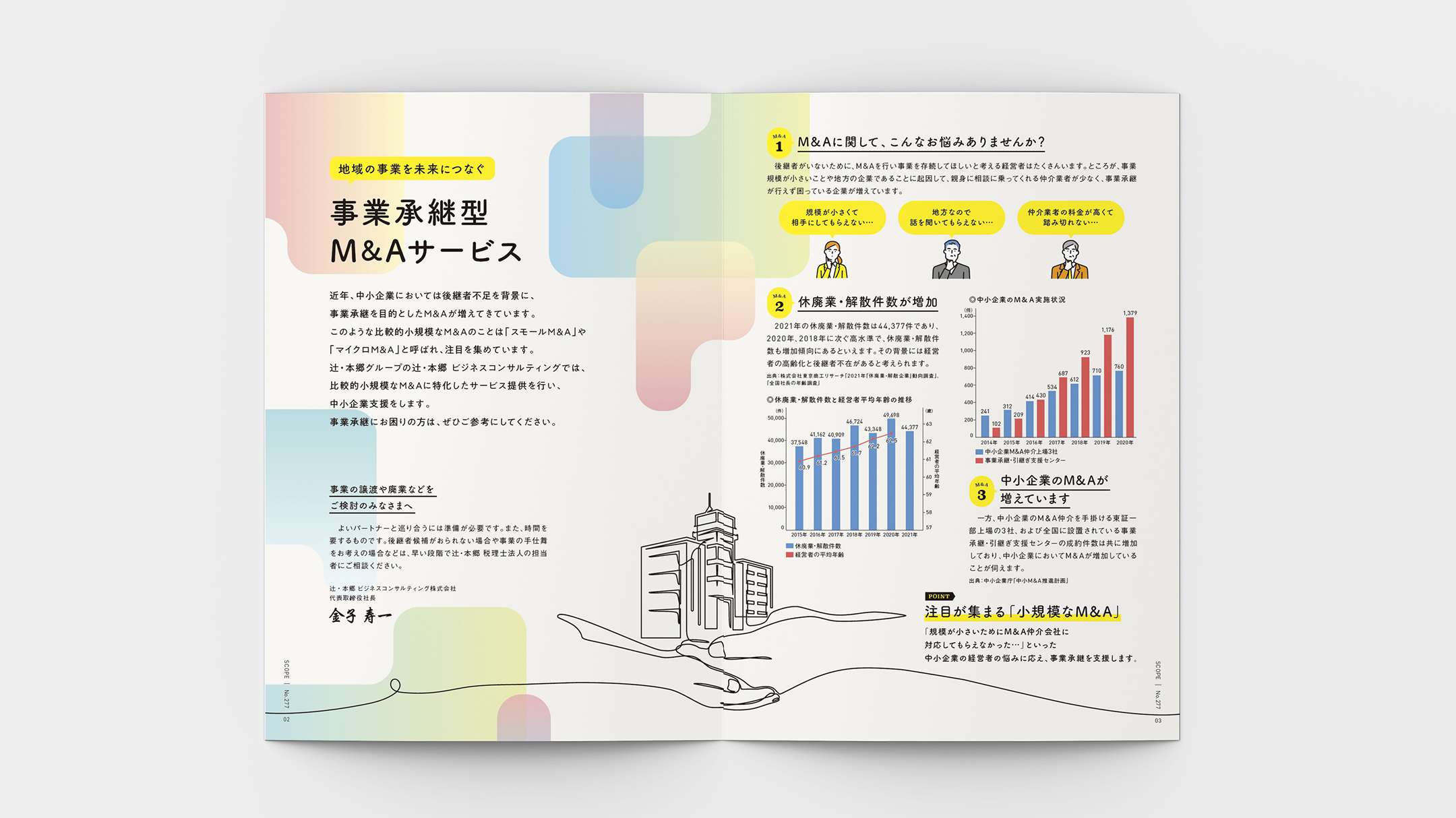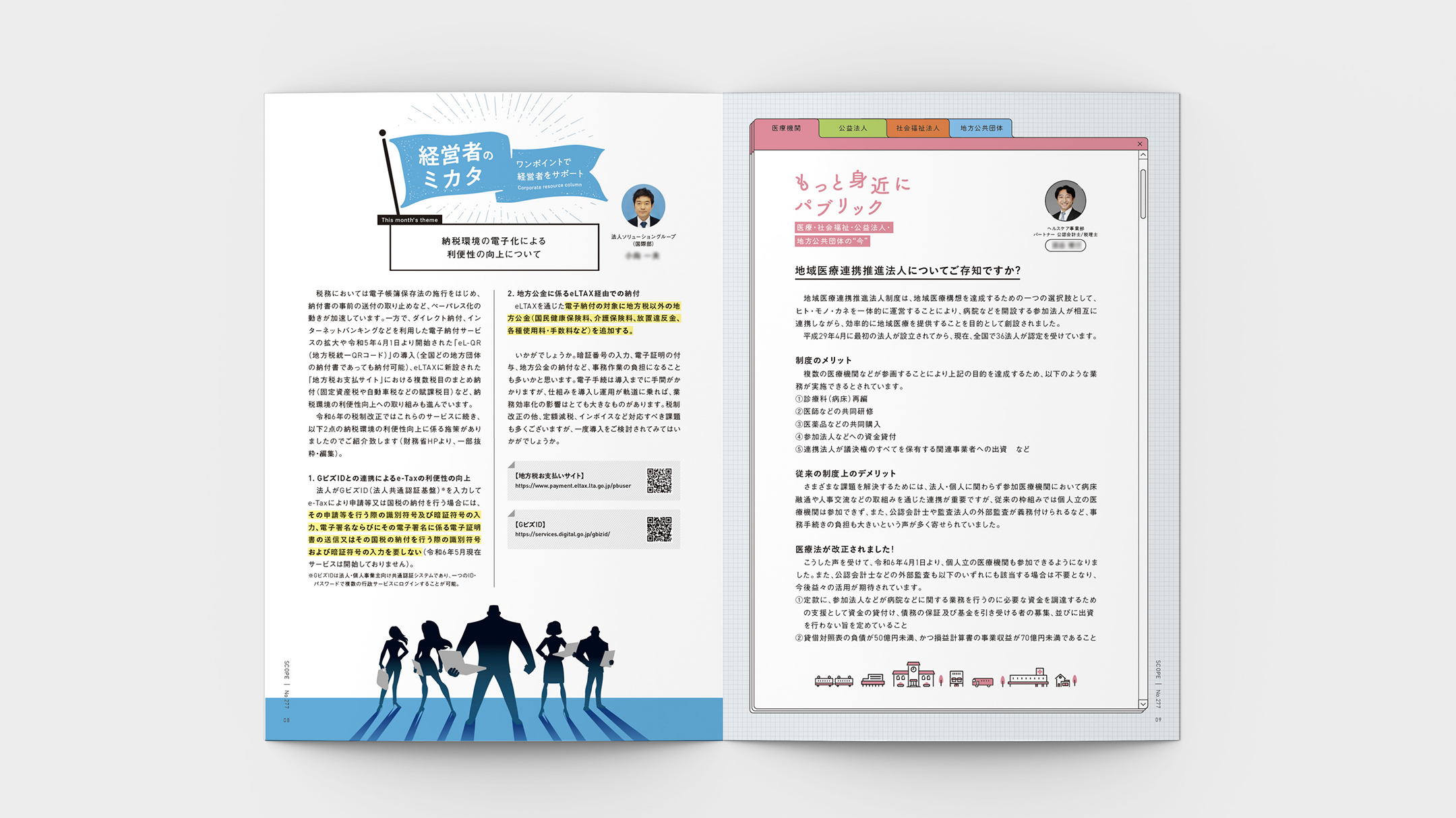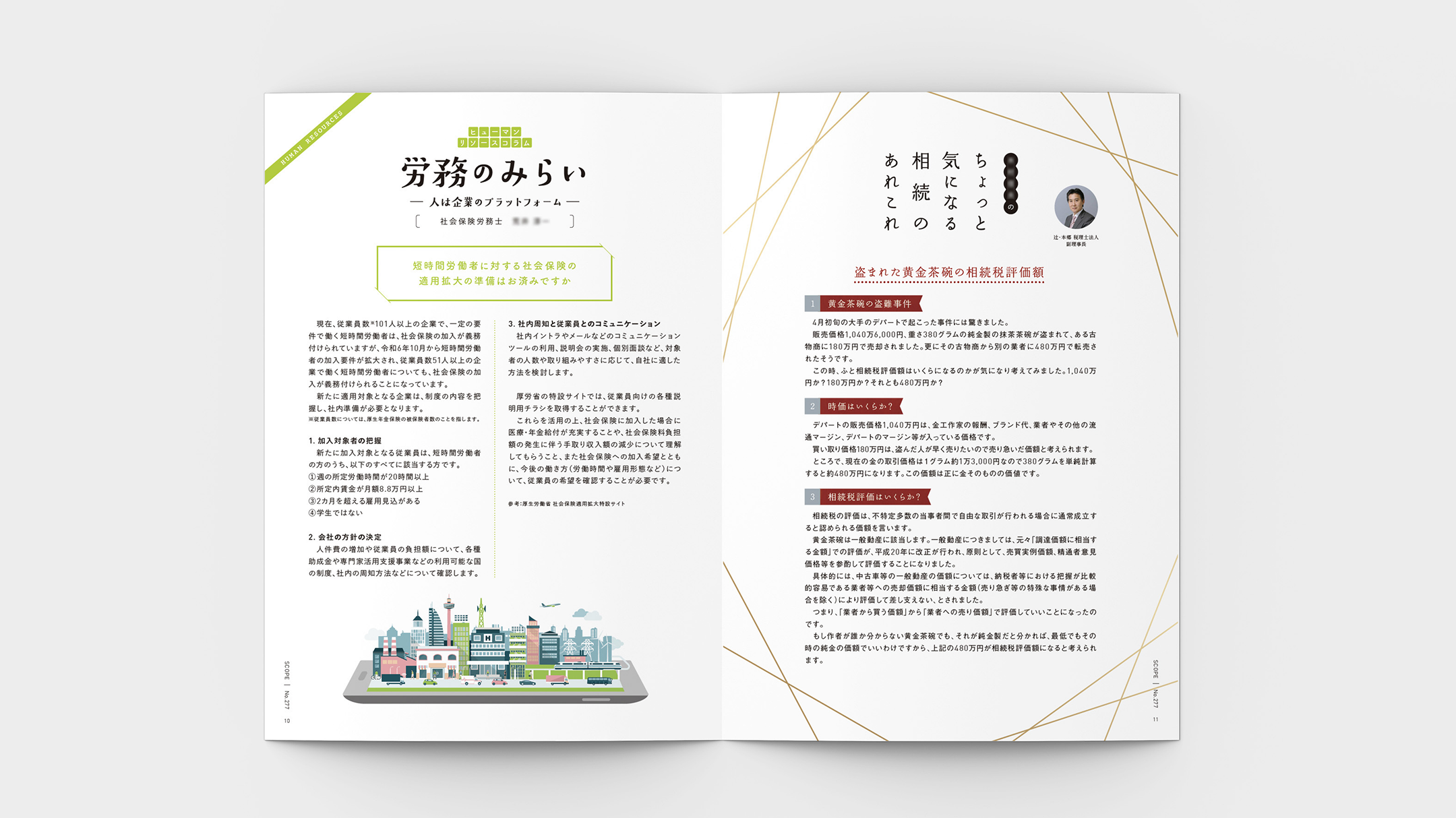 日本全国に約20,000件もの顧客を持つ日本最大級の規模と実績を誇る、辻󠄀・本郷 税理士法人が発行する広報誌。税制改正や相続といった難しいテーマを、図解やイラストを活用したやさしい表現でわかりやすく解説しています。顧客企業へのインタビューをもとに作成する取材記事など、独自の企画も読者から高い評価を得ています。
