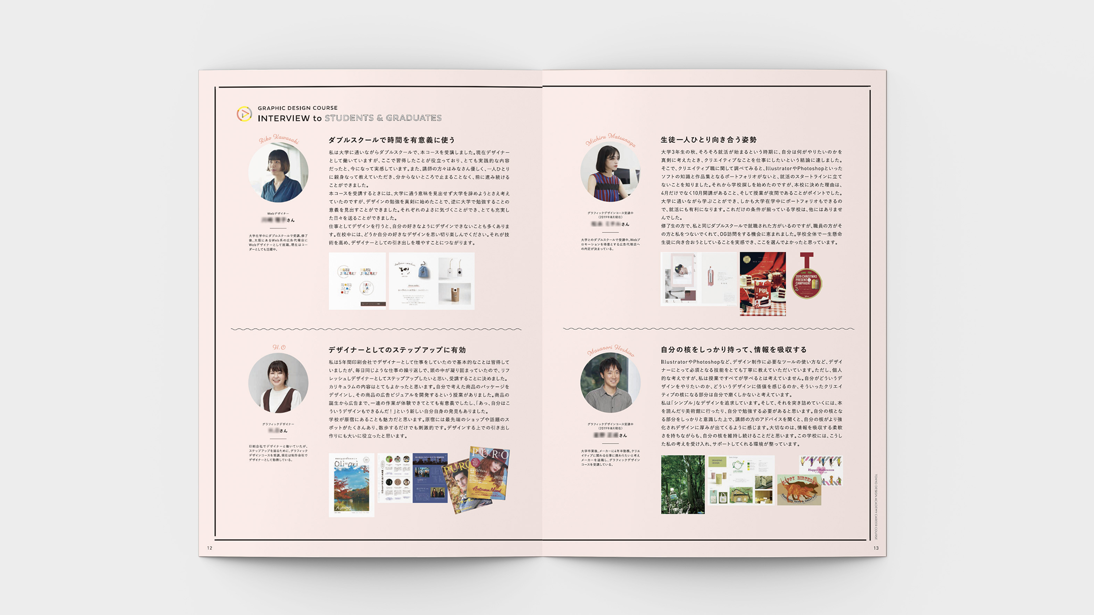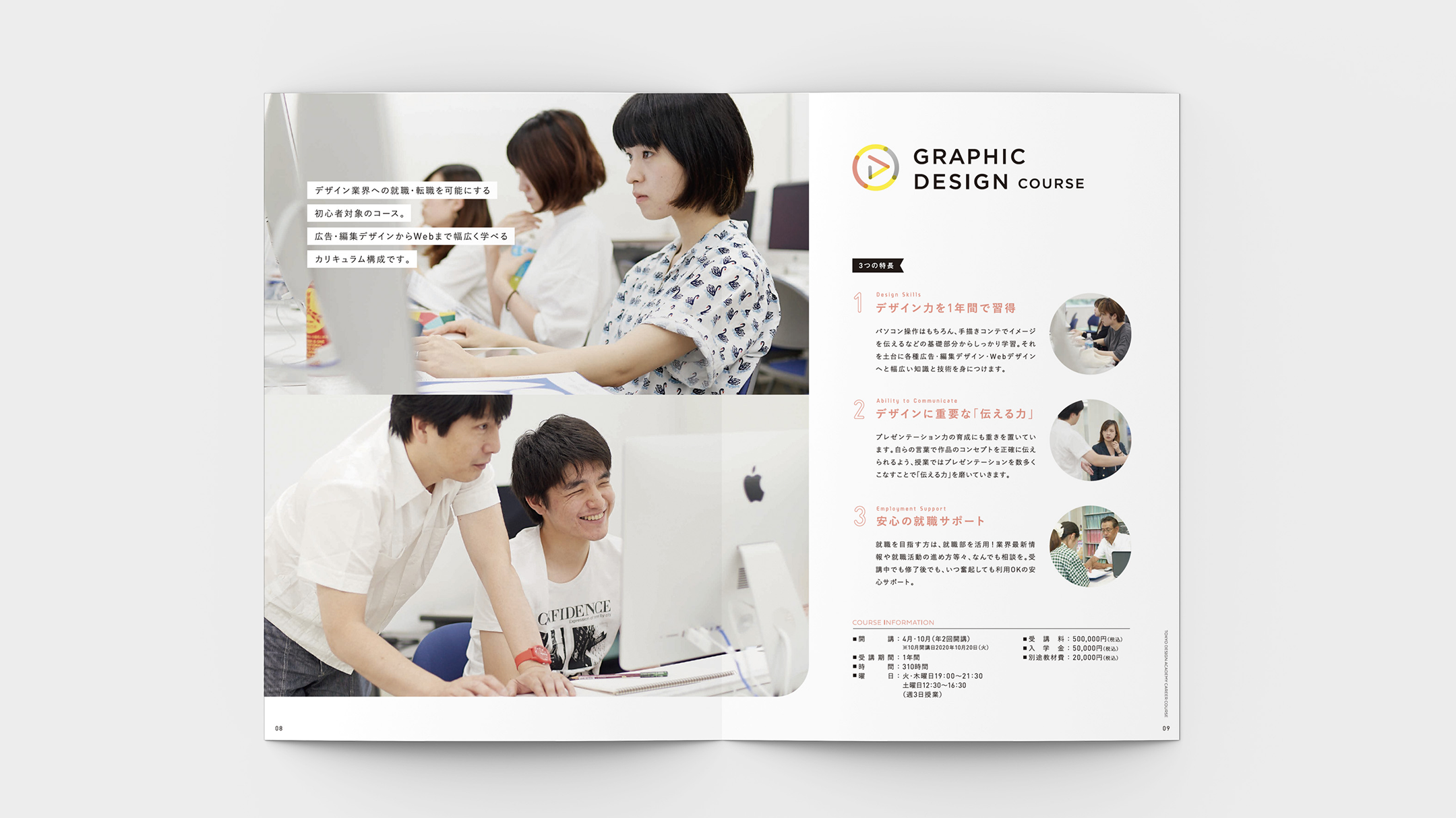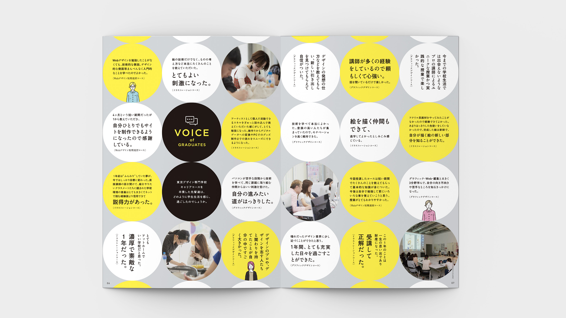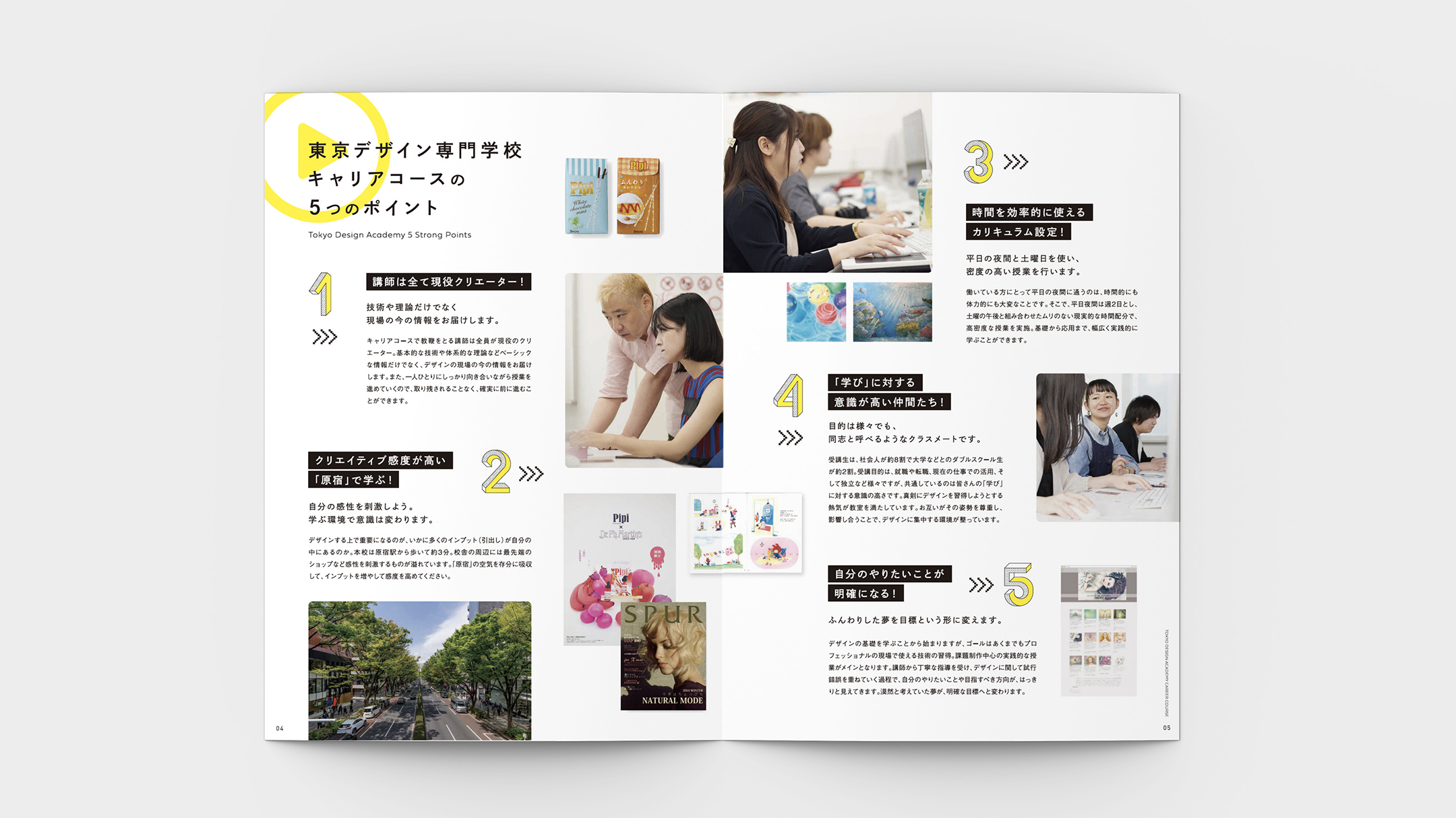 東京デザイン専門学校のキャリアコースを紹介する学校案内パンフレット。多彩なカリキュラムや実力派の講師陣、原宿という恵まれた立地など、同校の魅力をグラフィカルに表現しています。生徒や講師へのインタビューも交え、学びの姿勢や学校の雰囲気を多面的に紹介。デザインの専門学校にふさわしい、高いクリエイティブ品質で仕上げています。